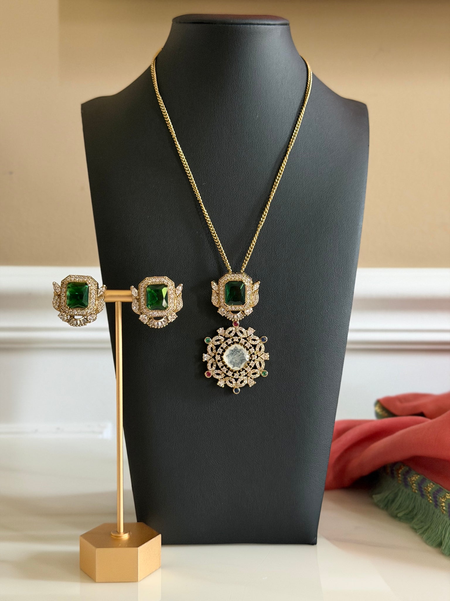 A neutral white doublet center stone with the sparkling green to add the perfect contrast. The pendant is studded with CZ and multi colored stones.